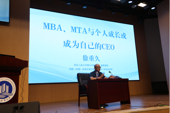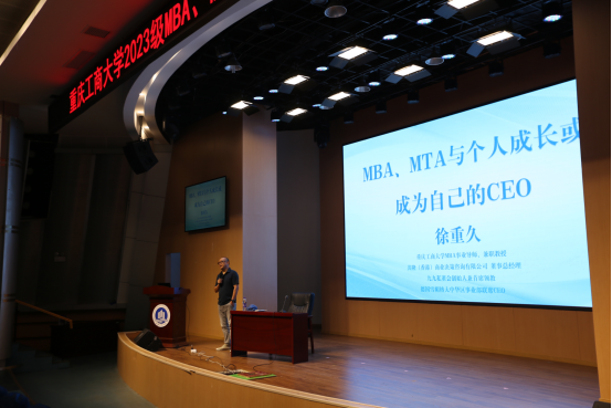 入学教育环节,MBA事业导师徐重久给新生带来了入学教育专题讲座《MBA、MTA与个人成长或成为自己的CEO》,徐教授针对自己的人生经历、实践案例以及结合给新生的三个问题“我是谁?”、“我为什么在这里?”、“我要去往何处?”给予新生启发与建议。