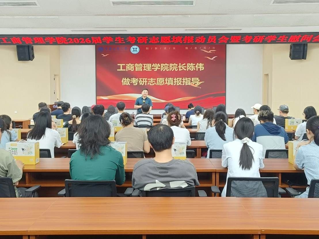 2025年9月18日,437必赢会员中心在明德楼1019会议室举行了2026届学生考研志愿填报动员会暨考研学生慰问会。学院党委书记陈亚惠、院长陈伟、党委副书记程亚、学院学工办主任谭予涵、辅导员樊少华、禹洋春、郑娴、黄韵以及部分2022级考研同学参加了此次活动。会议由学院党委副书记程亚主持。