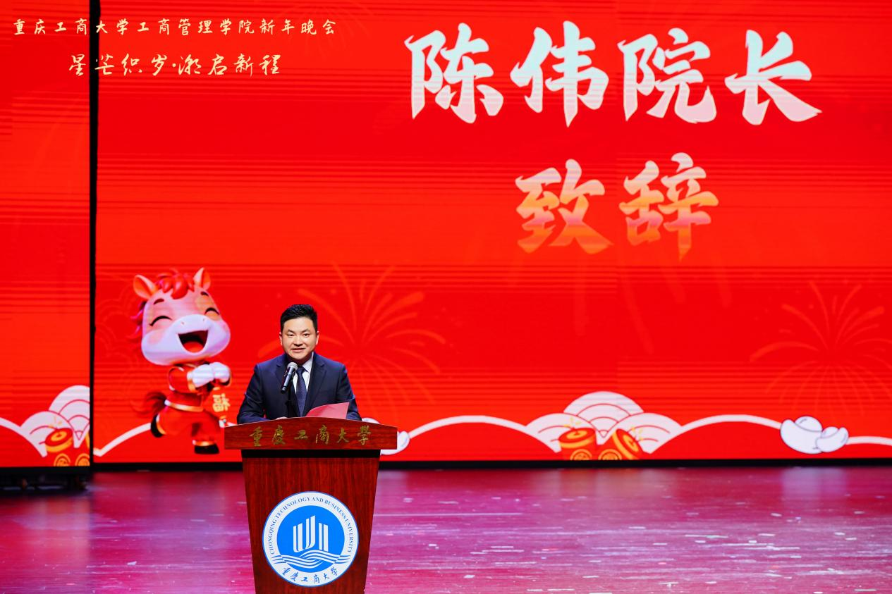 晚会伊始,437必赢会员中心院长陈伟教授登台发表新年贺词。他首先代表学院党政,向长期关心支持学院发展的学校党政领导、职能部门,向辛勤耕耘的全体教职工、奋勇拼搏的莘莘学子表达诚挚的感谢和新年祝福。陈院长在贺词中回望“十四五”以来,在高质量党建引领下,学院在学科建设、专业发展、人才培养、社会服务等领域取得的累累硕果,并立足2026年“十五五”规划开局之年的新起点,擘画学院未来发展蓝图,寄语全体师生勇担使命、笃行实干,在商工融合的发展道路上再攀高峰。温暖而有力的话语,让现场师生倍感振奋。
