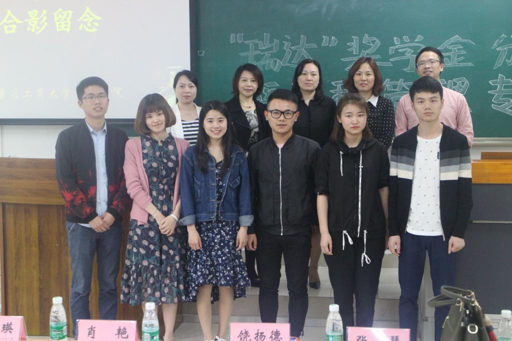 管理学院黄副院长首先致辞,感谢了重庆瑞达资产评估公司对工程管理专业的大力支持,并对在座的同学提出了新的希望和要求。随后,重庆瑞达资产评估公司的办公室主任张琴宣读了表彰决定,2013级工程管理专业徐睿等6名同学获得2017届“瑞达”奖学金并受到表彰。仪式最后,由工程管理系主任肖艳老师作了总结发言,肯定获奖同学取得骄人成绩的同时,鼓励其他同学以获奖同学为榜样,勇攀高峰、再创辉煌。