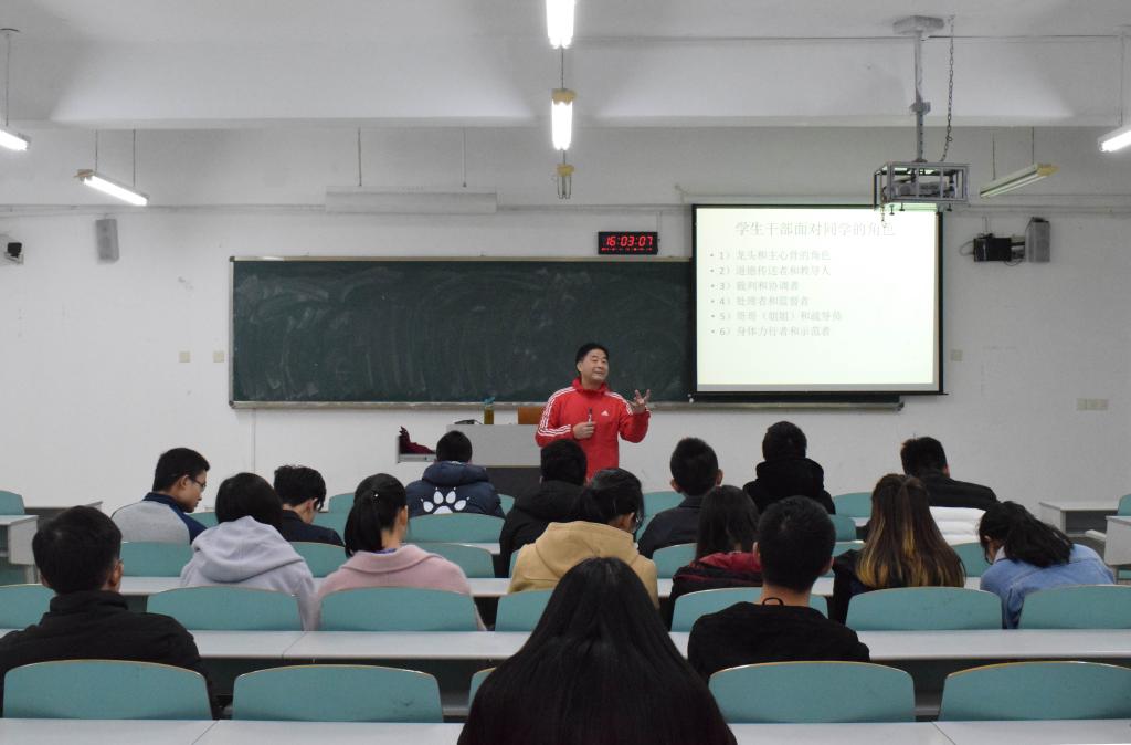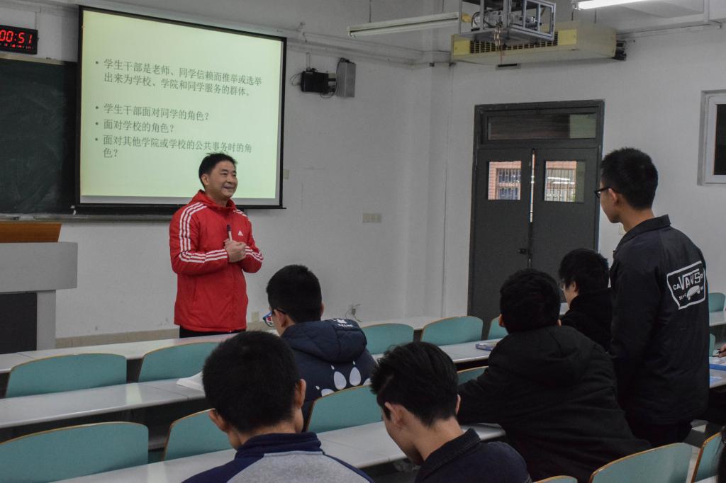 讲座上,唐仕军教授针对各个专业的不同提出“管理能解决什么问题”与在座的同学互动,进而引入此次讲座主题。随后,唐仕军教授向同学们分别介绍了在面对老师、同学以及其他学院或学校学生干部的不同角色。此间,学生干部黄敏发言道:“学生干部就是一个走在前面,起带头作用的角色。”紧接着唐仕军教授列举了学生干部选拔原则、以及对干部用人的几大心理误区进行了分析。此外,唐仕军教授还谈到了学生干部个体素质的含义、内容以及优秀学生干部所应具备的素质。
