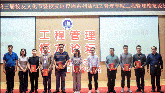 本次共授牌校企合作实习实践基地五家,为工程管理专业学子搭建了良好的社会实践平台;同时现场颁发了由重庆瑞达资产评估房地产土地估价有限公司设立的企业奖学金,瑞达奖学金设立9年,共计资助工程管理优秀学生54名;为充分发挥教师育人主导作用,营造全员育人氛围,有效推动思想教育与专业教育、课堂教育与课外教育相结合,促进学生全面发展。管理学院特成立工程管理校友导师计划,邀请工程管理系优秀校友担任专业导师,搭建校友与学院沟通平台,指导在校学生成长和职业发展。第一期导师计划共授予10名校友导师,他们分别是:03级校友、财信发展投资发展中心总经理马荷,04级校友、中垭建设集团项目经理王涛,05级校友、云南龙镁环境科技有限公司金小龙,05级校友、金科地产集团副总监吴边,05级校友、重庆时刻房地产顾问有限公司创始人赵明,06级校友、重庆市建设项目管理有限公司咨询事业部技术负责人任智勇,08级校友、重庆市城市建设管理学校BIM中心负责人张增全,10级校友、碧桂园川西南区域总裁助理文强,10级校友、重庆坤源衡泰律师事务所专职律师王露,11级校友、广联达教育培训事业部东南大区服务经理林俊杰。