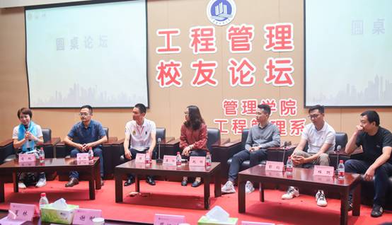 圆桌论坛由工程管理系主任肖艳老师主持,01-14级校友代表肖兴文、陈宸、李杨、赵明、彭均、程聪参与探讨建筑行业发展趋势及工程管理未来人才培养等问题。肖艳老师提出我校工程管理专业商科背景浓厚,发展方向与重庆大学、交通大学不同,致力于培养分层递进、多维融合商科背景下的工程管理人才。彭均学长通过自己公司招聘为例,赞扬了我校工程管理学子相比其他兄弟院校学子的优势。