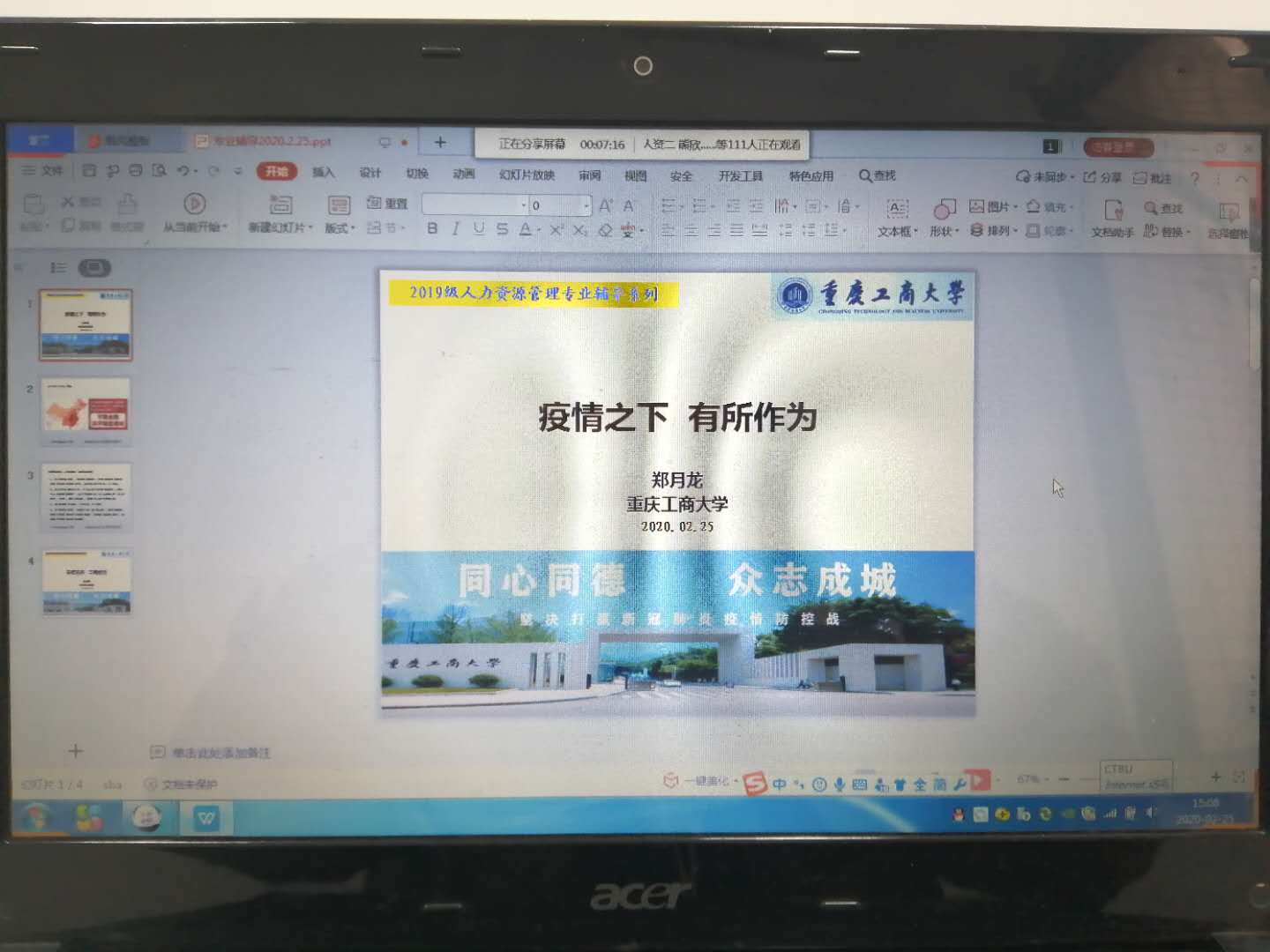 2020年2月25日下午3点以“疫情之下,有所作为”为题,通过QQ群直播平台,专业导师郑月龙博士面向2019级人力资源管理专业学生开展2020年春季学期在线教学前动员。