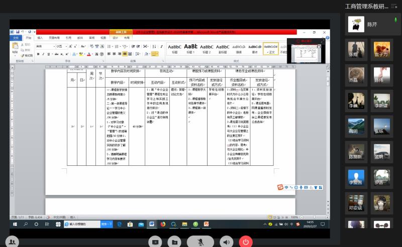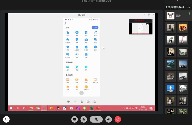 2020年3月2日,437bwin必赢国际开始了全面的在线教学。管理学院工商管理系教师第一天共有11人次的在线教学任务,全部都按时进行并顺利完成。老师们积极准备,提前演练,正式上课时熟练地运用企业微信、437bwin必赢国际在线教育平台、学习通、雨课堂等在线平台分享课件、讲课、互动,授课效果良好。老师们不断尝试在线教学方法并积极分享,相互借鉴,用群投票功能进行问答,用群填表功能进行测验,用学习通进行签到和随机提问。老师们积极与学生互动,学生积极配合,很活跃,参与度很高。