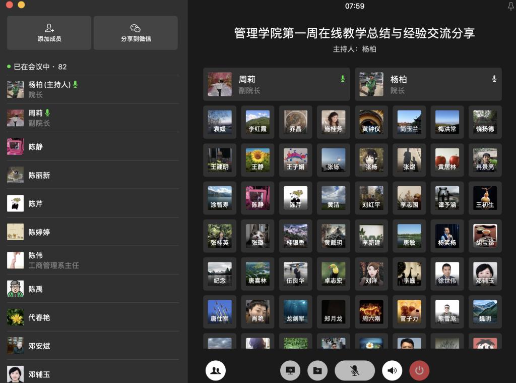 为及时发现教师在线教学中的问题,总结和交流在线教学心得、成功经验或典型做法,了解学生对教师在线教学的意见或建议,确保在线教学工作顺利开展,管理学院于3月6日下午14:00在企业微信平台召开在线开学第一周教学总结与经验交流分享会,杨柏院长主持会议,学院全体教职员工参加了会议。