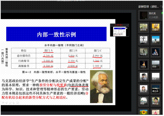 接着,郑月龙老师开展本次教学内容——薪酬结构设计,包括薪酬结构确定的流程和薪酬结构的内涵及关键性指标两个知识点。郑老师精心设计教学环节,采用多种教学方法,充分调动了学生学习的积极性、主动性。在教学中,郑老师首先回顾了与本次课内容相关的前续课程知识,薪酬体系设计基础和薪酬水平及外部竞争性;接着,对薪酬结构确定中的重点知识点内部一致性和外部竞争性,通过数据分析进行形象风趣的讲解,并结合马克思主义政治经济学,简单阐述了我国作为社会主义国家按劳分配与按要素分配有机结合的客观性。据此,郑老师着重指出以按劳分配和按要素分配为指导,具体到组织管理中就体现为按贡献分配,这是薪酬结构设计保证内部一致性的重要理论遵循;进一步地,郑老师在讲述薪酬结构关键性指标,如薪酬区间变动率、薪酬比较比率等,强调按贡献分配在其中的贯彻和体现,并结合习近平总书记2018年新年贺词“幸福都是奋斗出来的”、2019年9月1日开学第一课“立鸿鹄志,做奋斗者”的思想内涵,从人力资源管理学科知识融合的视角,借助《管理学》、《积极心理学》、《劳动经济学》等课程内容,指出薪酬结构设计作为一项管理活动,应该能够营造一种良好的氛围,让员工能够在这种氛围下“幸福的奋斗”,这是管理者的责任和使命,也是贯彻习总书记谆谆教诲的体现;郑老师在讲到知识点“同一组织相邻两个薪酬等级之间的交叉与重叠关系”时,针对知识点“在实践中,大多数情况下,企业倾向于将薪酬结构设计成有交叉重叠的,尤其是中层以下的职位”,与学生进行了“问-答-分析”式的互动,如线下教学那样自如。整节课下来,郑老师的课堂知识点突出、讲解通俗易懂、思政与专业知识融合到位、课堂活跃,保证了线上与线下教学质量和教学效果的同质。