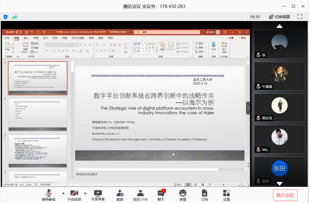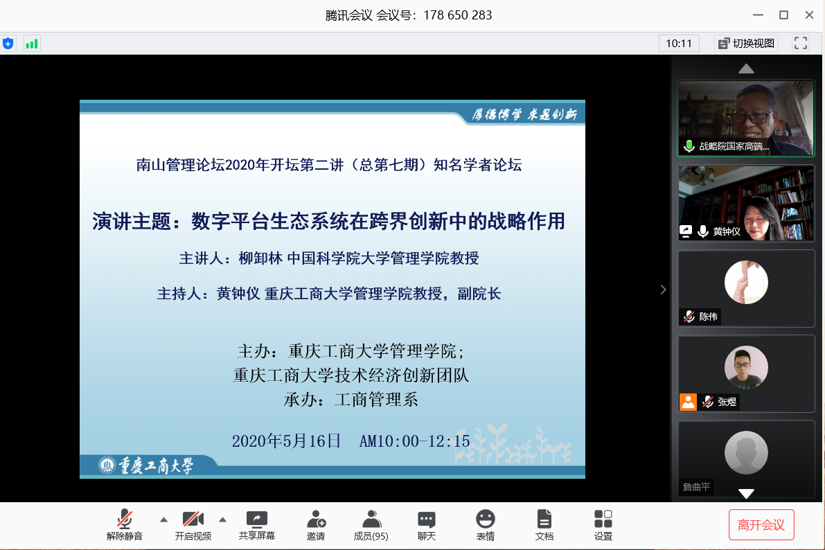 2020年5月16日上午10:00-12:15,437bwin必赢国际管理学院南山管理论坛与校技术经济创新团队邀请中国科学院大学柳卸林教授,通过腾讯会议作了题为“数字平台生态系统在跨界创新中的战略作用”的在线学术讲座。这是我校南山管理论坛第七场学术讲座,是2020年举行的第二场云端知名专家讲座,我校100余名师生及几十名包括北京大学、山西大学、西南大学在内的部分校外学者聆听了本次报告,并进行了互动和交流。