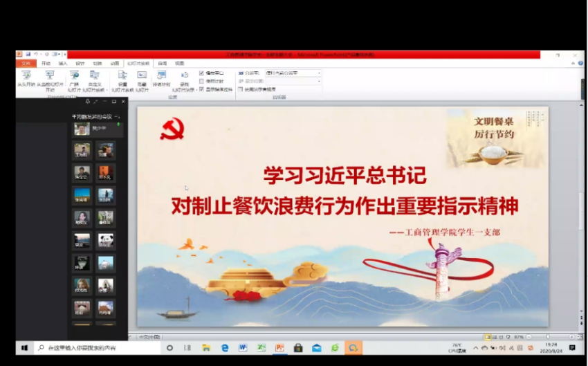 本科学生支部书记介绍说“习近平总书记近日对制止餐饮浪费行为作出重要指示,我们党员师生必须在反对餐饮浪费上走在前、做表率”,在主题党日活动中,同学们纷纷忆祖辈往事、谈感受、作承诺。同学们谈到“想起自己爷爷奶奶那一辈的老人们,勤俭节约已深入骨髓了,从小就教育我们一粒一饭来之不易。全球每天约8.8亿人挨饿,而每天有大量的食物因过了保质期、人为浪费等因素,被浪费。如果将其四分之一回收或有效利用,就足以解决9亿人的吃饭问题。我们国家在党的坚强领导下,一步一步从吃不饱走向了有盈余,从贫困迈向了小康,我们大学生尤其是党员更应该带头践行勤俭节约。