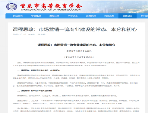近日,中国高等院校市场学研究会、重庆市高等教育学会先后刊发437必赢会员中心彭建仿教授及其市场营销专业团队关于市场营销一流专业建设与课程思政融合发展的相关探索与实践。