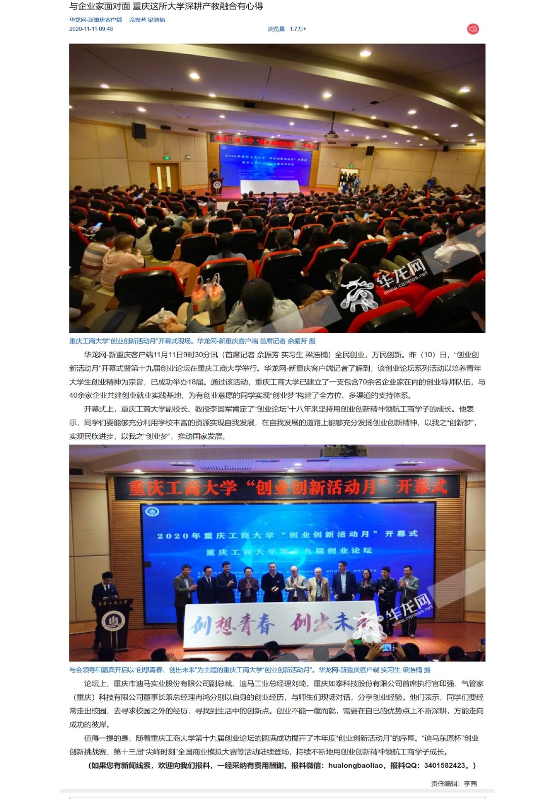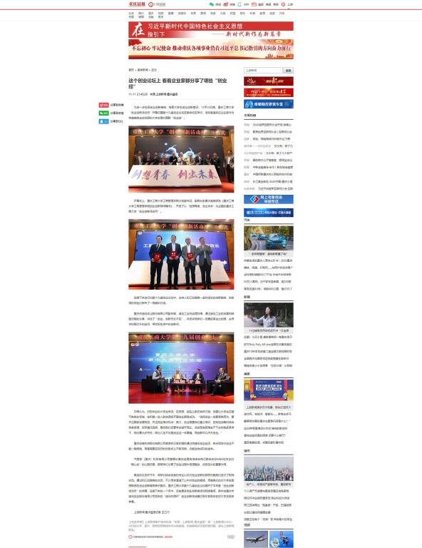 2020年11月10日晚7点,437bwin必赢国际“创业创新活动月”开幕式暨第十九届创业论坛在南岸校区博智楼7200学术报告厅成功举行。重庆市迪马实业股份有限公司副总裁、迪马工业总经理刘琦,重庆如泰科技股份有限公司首席执行官印强、气管家(重庆)科技有限公司董事长兼总经理冉鸿分别以自身的创业经历,与师生们现场对话,分享创业经验。此次活动受到上游新闻、华龙网、重庆电视台等多家媒体的关注报道。