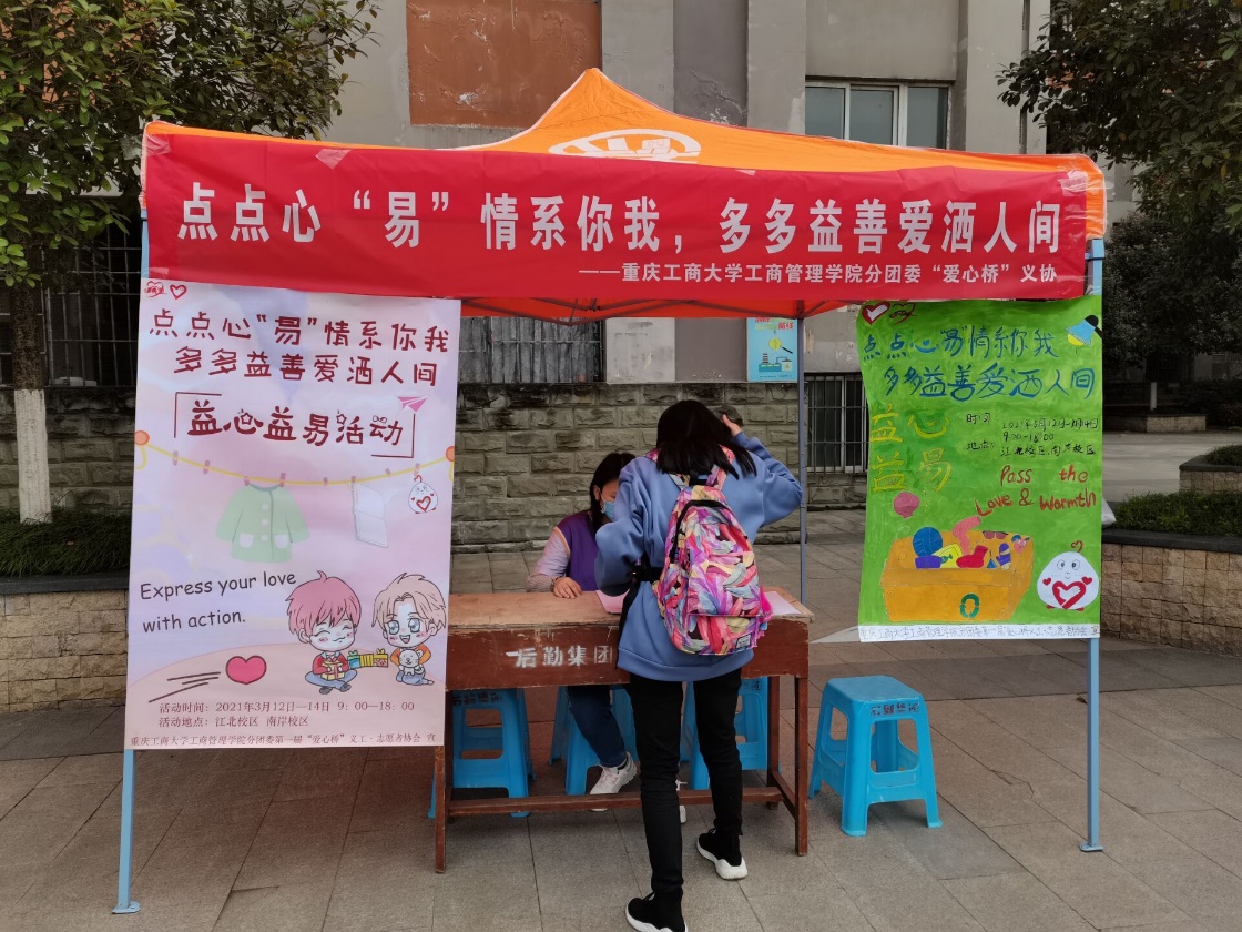 爱是连接人与人之间的组节、心与心之间的纽带。“赠人玫瑰,手留余香。”为了将闲置物品最大化利用,践行“奉献、友爱、互助、进步”的志愿服务精神,2021年3月12日-3月14日,437必赢会员中心分团委“爱心桥”义工•志愿者协会分别在437bwin必赢国际江北校区和南岸校区设点,举办了以“点点心‘易’情系你我,多多益善爱洒人间”为主题的益心益易活动,旨在用小小的物资传递出大大的能量。