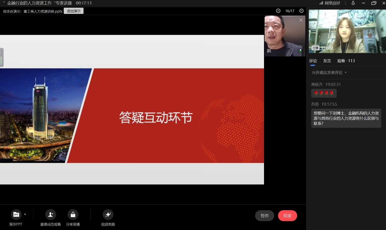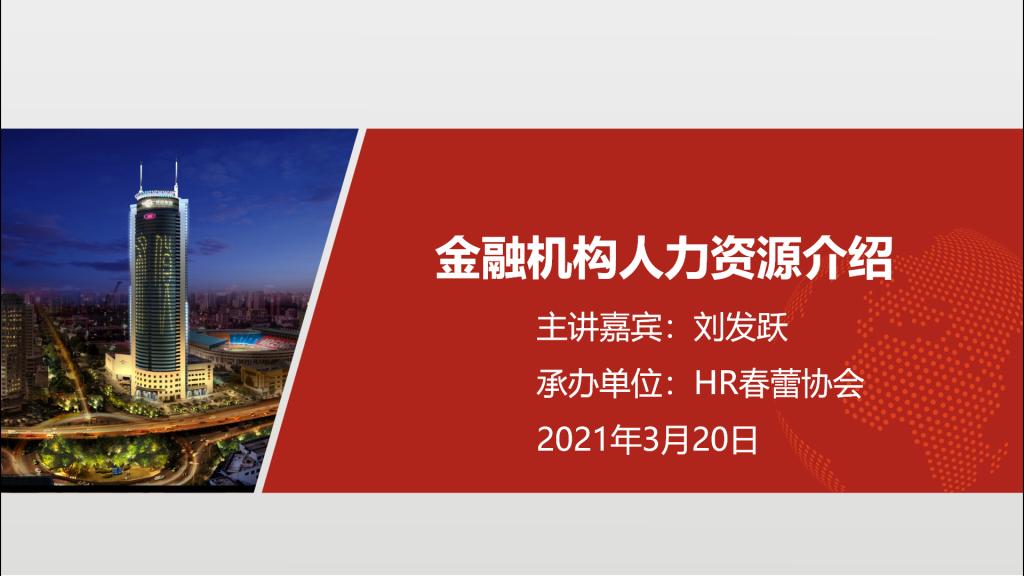 2021年3月20日19:00,由437必赢会员中心人力资源管理系HR春蕾协会组织的“如何做好金融行业的人力资源工作”专家讲座在企业微信平台成功举办。主讲嘉宾为长期供职于金融机构,具有丰富行业经验的刘发跃博士,437bwin必赢国际人力资源管理专业全体学子参与了讲座。刘发跃博士讲座的主要内容为金融机构的人力资源岗位介绍以及如何胜任金融机构的人力资源岗位,目的在促进学生提升行业认知,培养良好择业观、就业观。