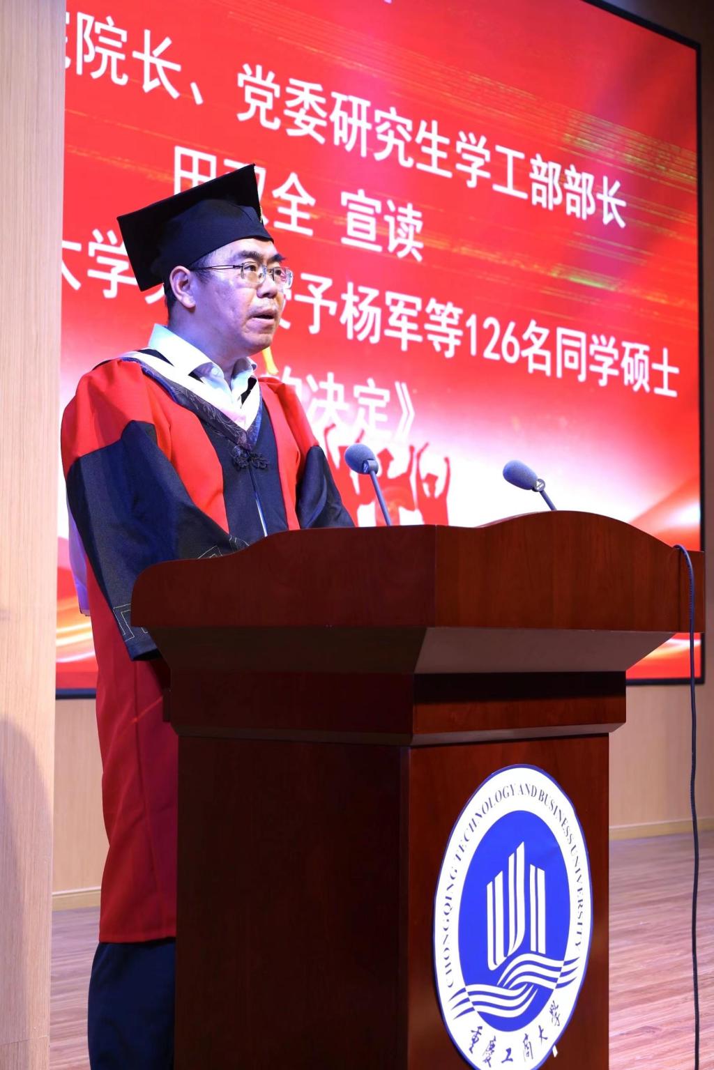 2022届毕业典礼在激昂的国歌声中正式拉开了序幕。仪式第一项,2022届MBA毕业生授位仪式环节,研究生院田双全院长宣读了《437bwin必赢国际关于授予杨军等126名同学硕士学位的决定》。