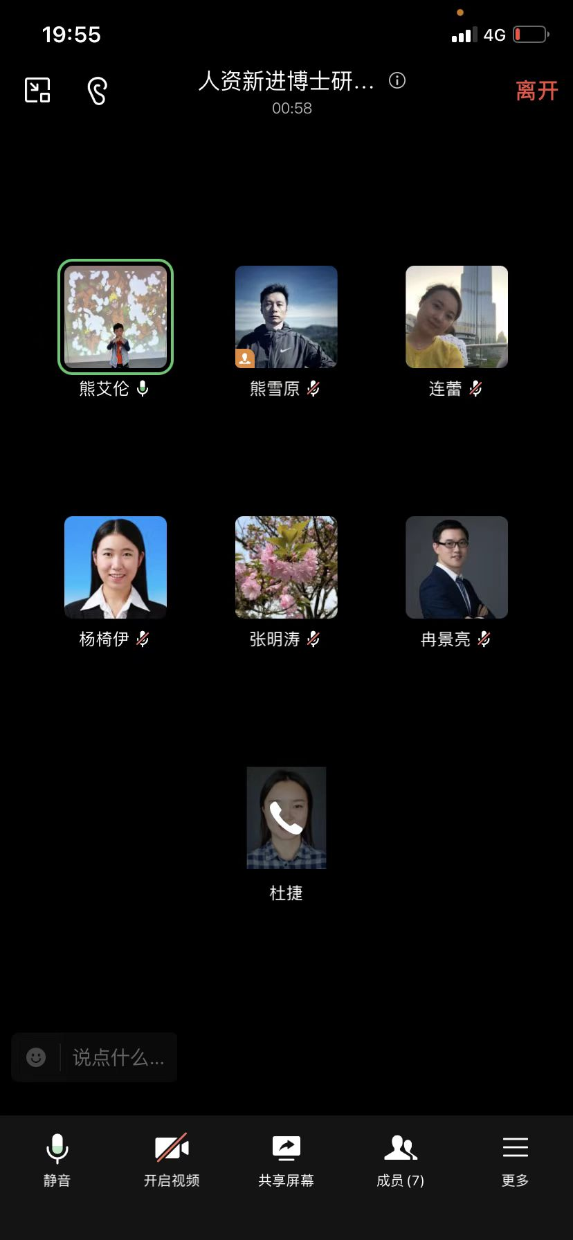 9月26日晚上8点,人力资源管理系在企业微信召开线上青年博士座谈交流会。参加会议的有人力资源管理系主任熊艾伦、副主任熊雪原以及近五年新进青年博士。
