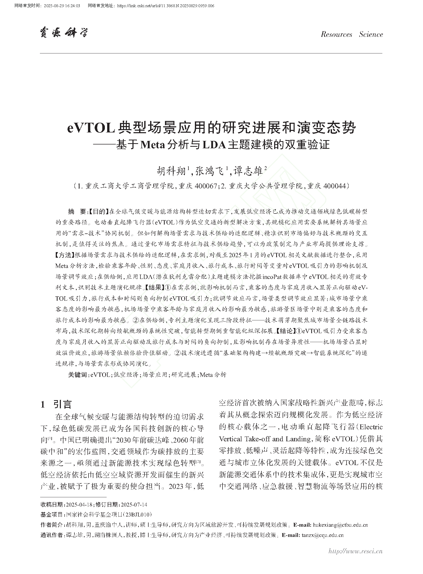 胡科翔,张鸿飞,谭志雄.eVTOL典型场景应用的研究进展和演变态势——基于Meta分析与LDA主题建模的双重验证[J/OL].资源科学,1-16.https://link.cnki.net/urlid/11.3868.N.20250829.0959.006.