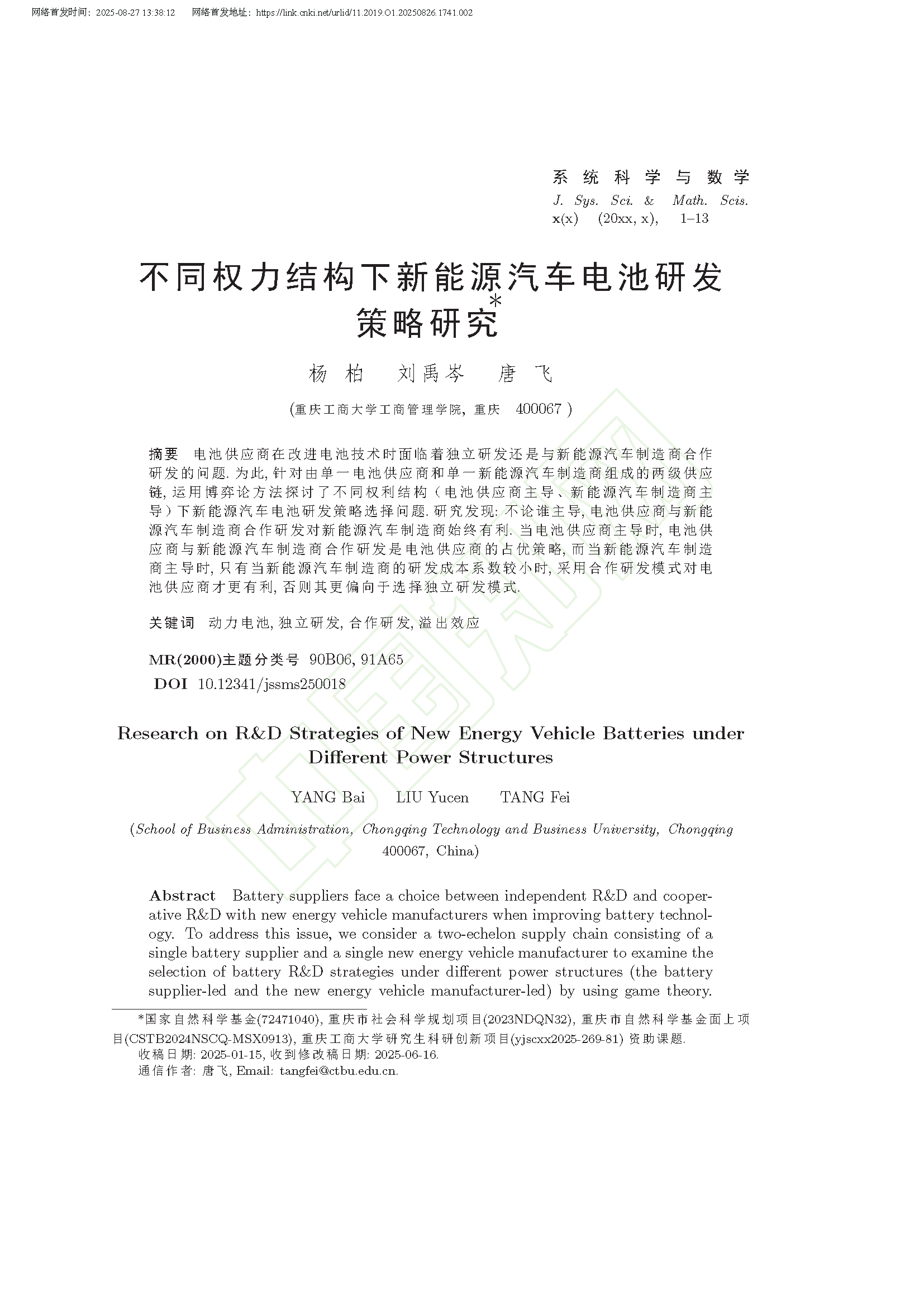 杨柏,刘禹岑,唐飞.不同权力结构下新能源汽车电池研发策略研究[J/OL].系统科学与数学,1-13.https://link.cnki.net/urlid/11.2019.O1.20250826.1741.002.