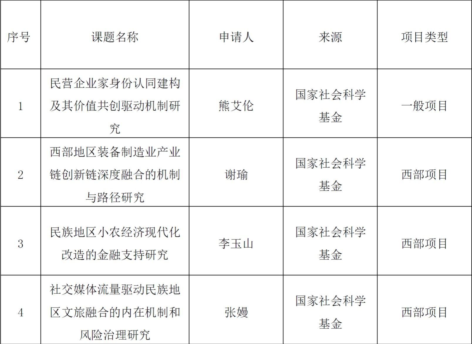 2025年9月5日,全国哲学社会科学工作办公室公布了2025年国家社会科学基金年度项目的立项名单,我院熊艾伦教授、谢瑜副教授、李玉山副教授、张嫚博士喜获国家社会科学基金项目立项资助。