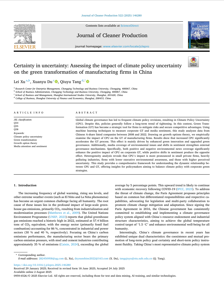 Xu L, Du X, Tang Q*(通讯作者). Certainty in uncertainty: Assessing the impact of climate policy uncertainty on the green transformation of manufacturing firms in China[J]. Journal of Cleaner Production(中科院SCI一区TOP期刊,437bwin必赢国际A1期刊), 2025, 522: 146280. https://doi.org/10.1016/j.jclepro.2025.146280.