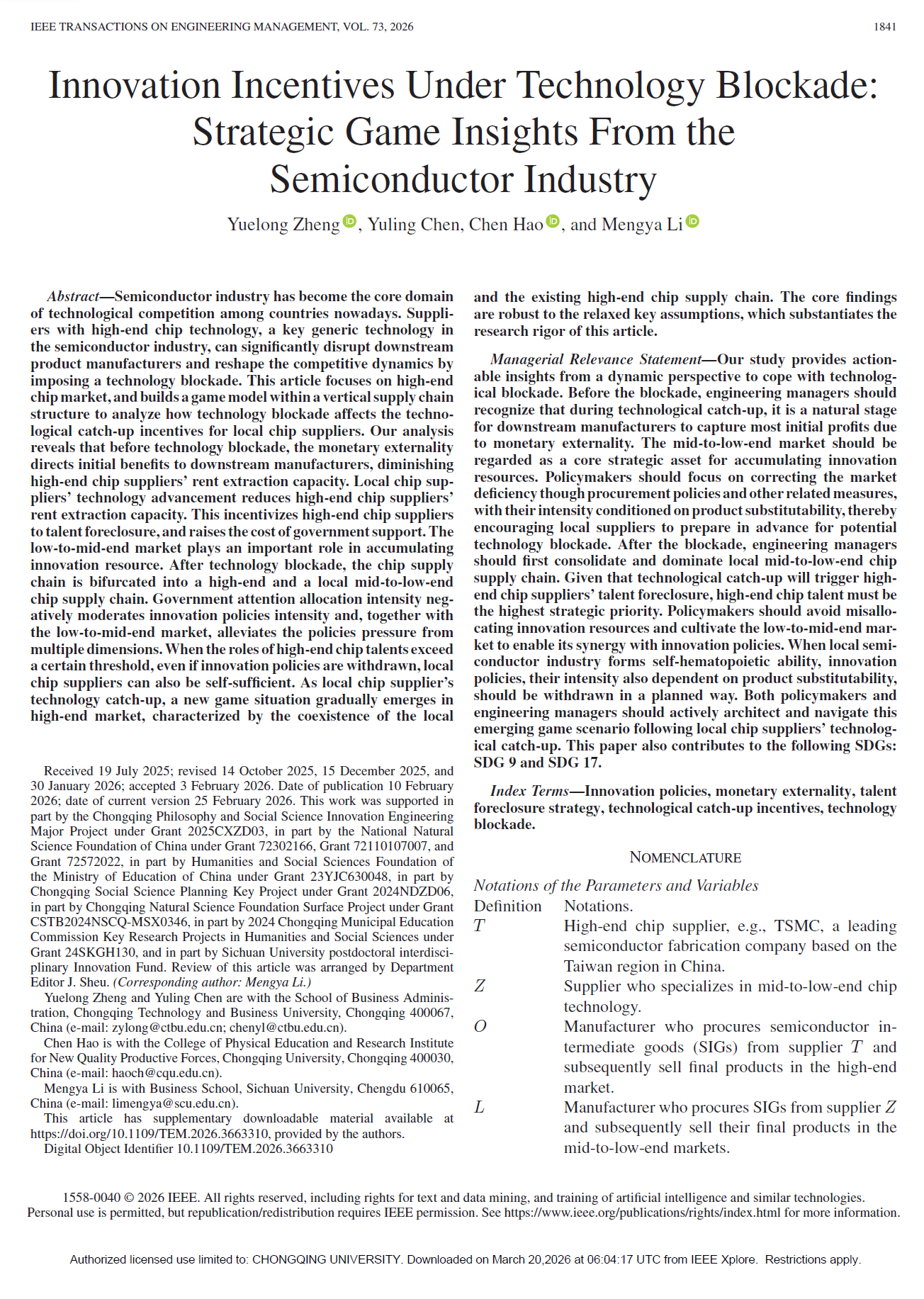 Zheng, Y., Chen, Y., Hao, C., & Li, M. Innovation Incentives under Technology Blockade: Strategic Game Insights from the Semiconductor Industry.IEEE Transactions on Engineering Management, 2026, 73:1841-1854.