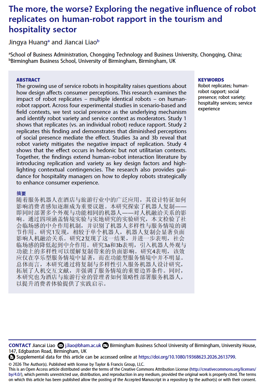 HuangJY,LiaoJC. The more, the worse? Exploring the negative influence of robot replicates on human-robot rapport in the tourism and hospitality sector[J].Journal of Hospitality Marketing & Management.2026,1–25.https://doi.org/10.1080/19368623.2026.2613799.