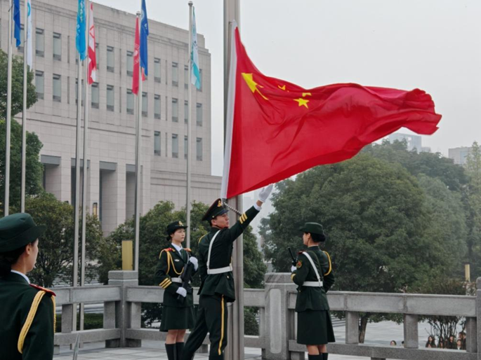 仪式伊始,国旗护卫队身姿挺拔、步伐铿锵,护送着鲜艳的五星红旗稳步迈向升旗台。在激昂的《义勇军进行曲》旋律中,五星红旗冉冉升起,全体师生肃立行注目礼,高唱国歌,歌声响彻校园,表达着对祖国的无限崇敬与热爱。