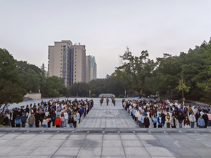 为厚植学生爱国情怀,激发师生奋进力量,2025年11月4日,437必赢会员中心组织学生于含弘广场参与了一场庄重且意义非凡的升旗仪式,以饱满的精神状态开启新一周的奋斗篇章。出席本次升旗仪式的有437必赢会员中心分团委书记、学工办主任谭予涵,学生会指导老师边子华,主持人为杜天。