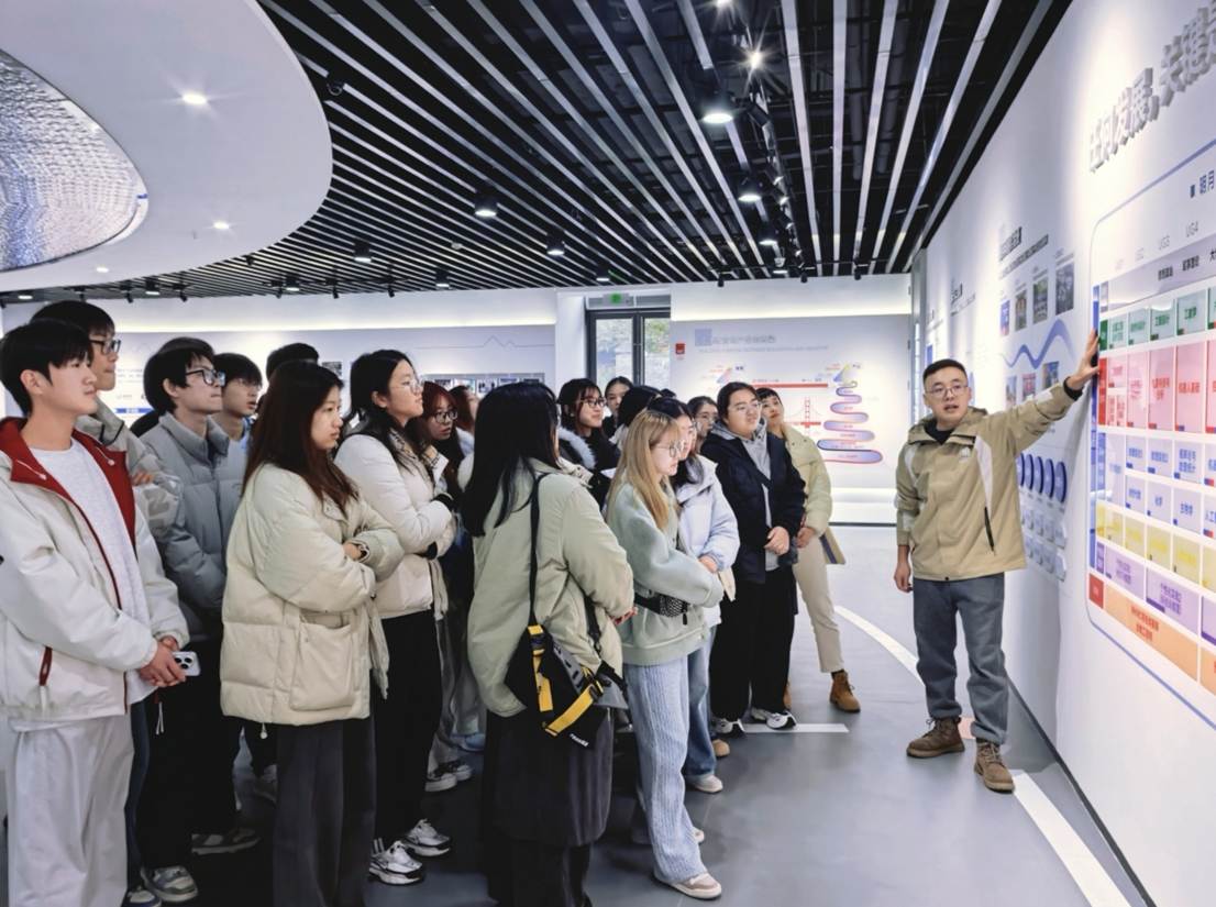 下午两点,同学们在项目负责老师的带领下步入基地展览中心。437必赢会员中心党委书记、副院长陈亚惠在参观前表示:“我们将课堂‘搬’进科创基地,就是希望同学们在起步阶段就能触摸到学科融合的脉搏,在行走中思考,在体验中学习。”展厅内,从基础科研到产业转化的创新链条清晰呈现,同学们认真聆听讲解,不时交流提问,在实景中理解管理思维与工程技术的结合点。