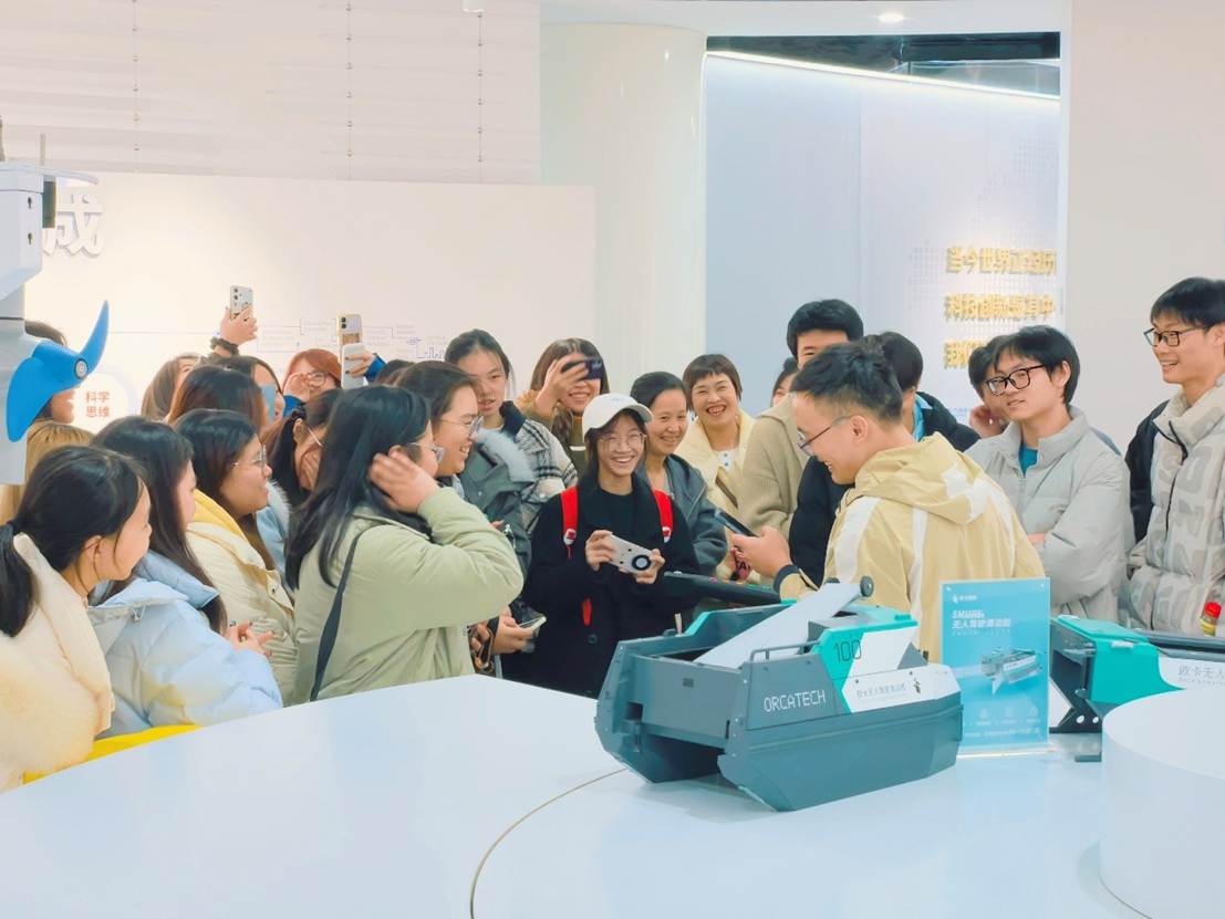 在实验互动区域,标有“ORC TECH”的智能设备吸引了众人驻足。同学们不仅观摩演示,更在讲解老师的引导下亲手体验,现场气氛活跃。背景墙上“当今世界正站在科技的肩膀之上”的标语,恰如其分地呼应了这次行走课堂的主题——让知识走出书本,让学习连接现实。